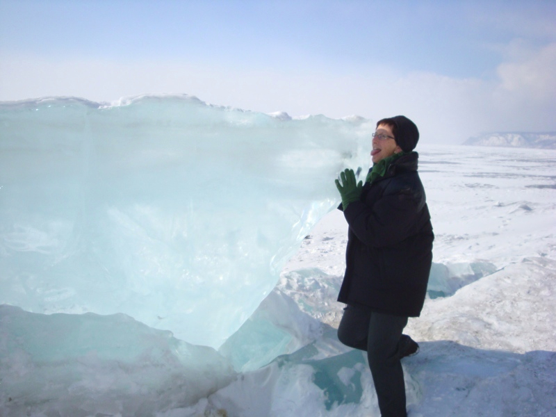 Lake Baikal is sunny but cold at 0-1F degrees and a hoped for high of 20 or so. It can and does get to -40 but thankfully it is the start of spring now, or so the locals say. Not much in town and very cold. We visited the local cemetery then walked magnificent Lake Baikal. It gives me a funny feeling as I look down: there are ice cracks and fissures, snow patterns under ice, cars, divers and dog sleds on the ice. The ice is up to 6-8 feet thick and clear. It is all quite beautiful and unique. Mountains can be seen in the distance. The pressure ice piles up in huge blocks at the edge. Looking over this largest and deepest lake in the world toward Mongolia, I feel much like Shackleton must have felt crossing the Antarctic.