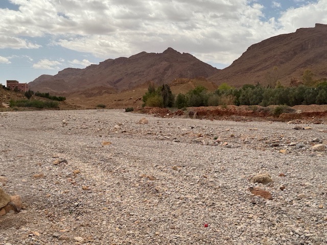 The terrain is ever changing in the Sahara. Dunes, bare rock, greenish mountainsides indicating some rain, vast fields of produce and trees. The Atlas Mountains are ever-present in the near distance. The landscape lies between the High Atlas and the Small Atlas. And everywhere lie rocks, rocks and more rocks of all sizes. Almost as numerous are the sheep.