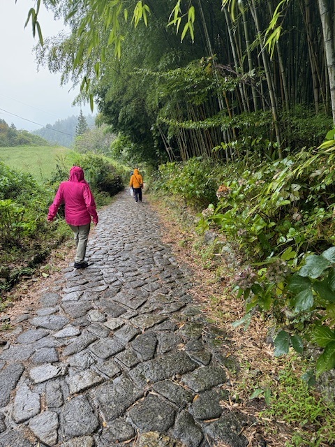 The path is peaceful (except for us), uncrowded (except for us) and carves its way through a tall cedar and bamboo forest. Sounds of rushing water remain a constant reminder of the amounts of rain that fall in these mountains. It also explains why eyerything appears lush and green. The occasional large waterwheel freely operates along these waterways.