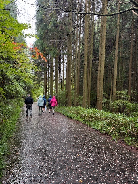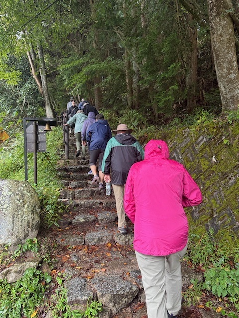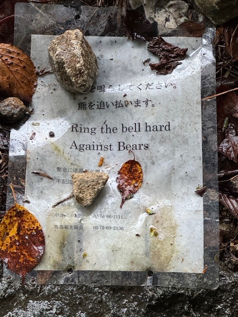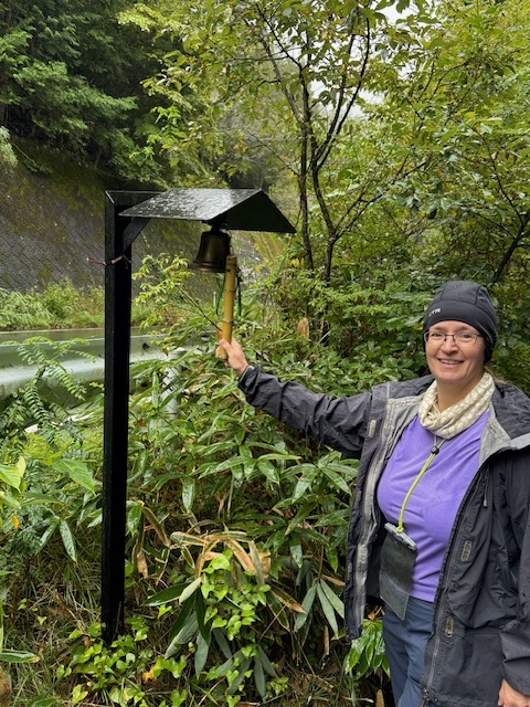 Because of rain, we avoid the steep one mile uphill climb to the waterfalls. Instead, after visiting Odaki and Medaki, we cross the highway to begin the gentle 2-mile descent into the post town of Megome. At the start is an irresistible bell, which seems to announce our entry onto this historic path. Actually, it represents a bell to ward off bears, or possibly attract them that a new meal has entered the trail.