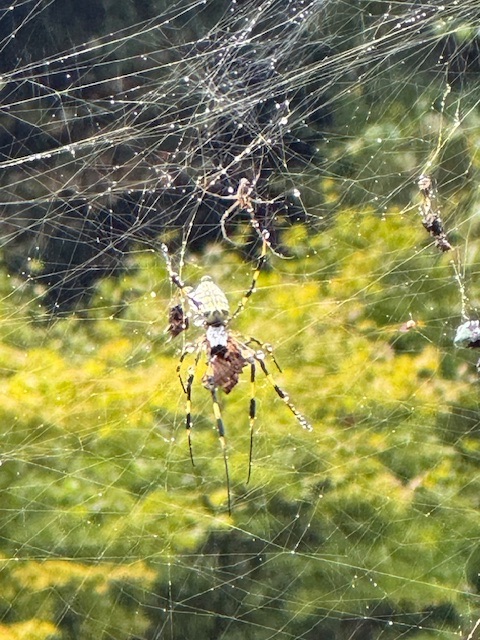 These female Jorō is striking, with bright yellow bands mixed with black, and often red or bluish markings on their long legs and abdomen. Females are much larger than males, with bodies reaching over in inch and legs spanning 3-4 inches across. Males are small and brownish, often barely noticed. Personally, she reminds me of the Black Widow and her tiny male mate, which she kills after sex.