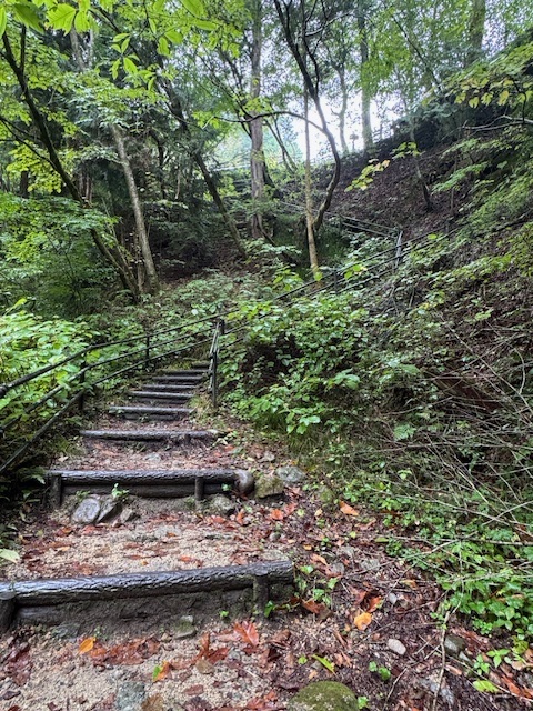 Just a short ride from Tsumago, one finds a long staircase and short path leading down to raging twin waterfalls. The setting is serene, surrounded by forest, mossy trees and rocks, and rushing mountain streams. I appreciate that the day is cloudy and cool.