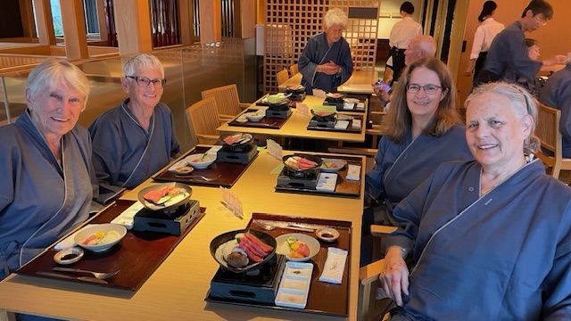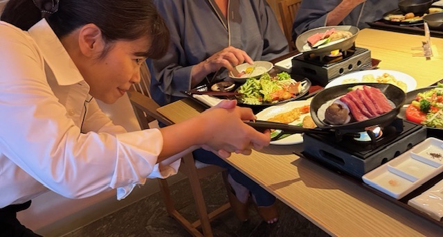 In the evening, we dine in the hotel. Every dinner service varies a little but always serves at least a dozen little bits in its own special dish or bowl. Tonight is no different. We each have a brazer where we can grill our own small strips of beef. Not enough food? The buffet is around the corner.