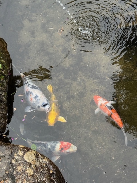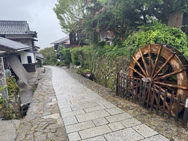 A small gurgling koi pond and the sound of water wheels turning along the path breaks the silence. Mist lingers in the valley, obscuring the view of the mountains that frame the town, but the entire scene feels like a painting.