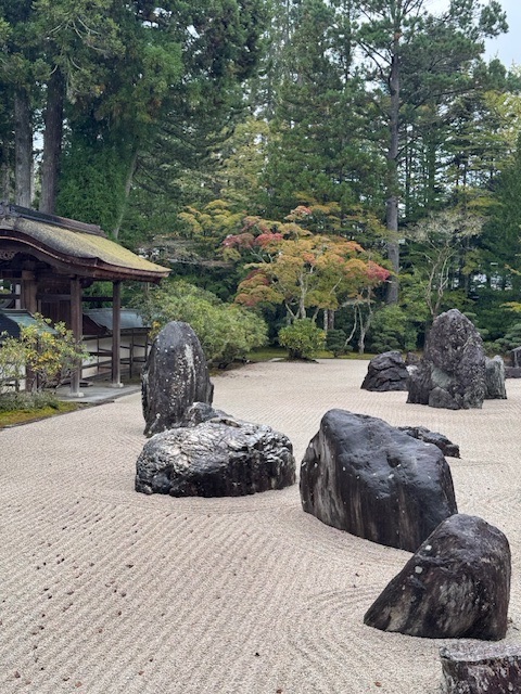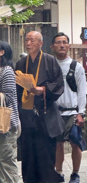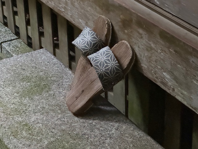 Like all the pilgrims, and Kōyasan tourist, we lodge for the night at a shukubō, Ekoin Pilgrim’s Lodging. The room is of traditional style, simple and comfortable. I find I am fortunate as I have two chairs, a window and a garden terrace. The window is important as there is no air and possibly no heat. We get three slippers: room, toilet, and garden.