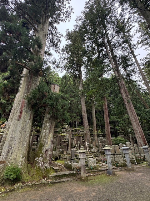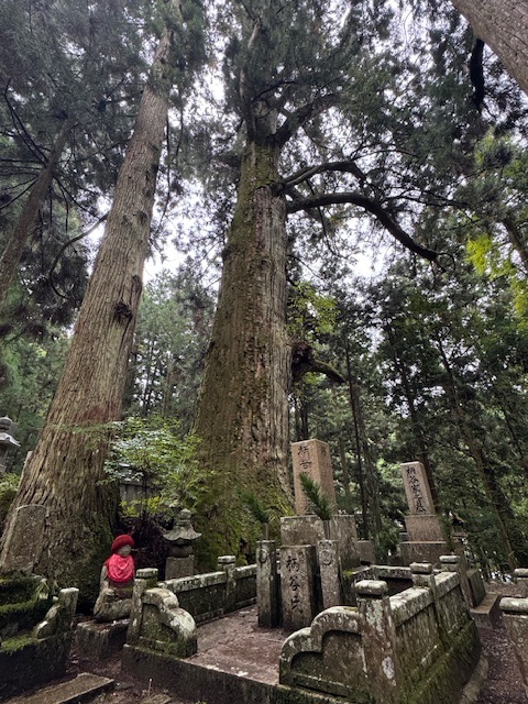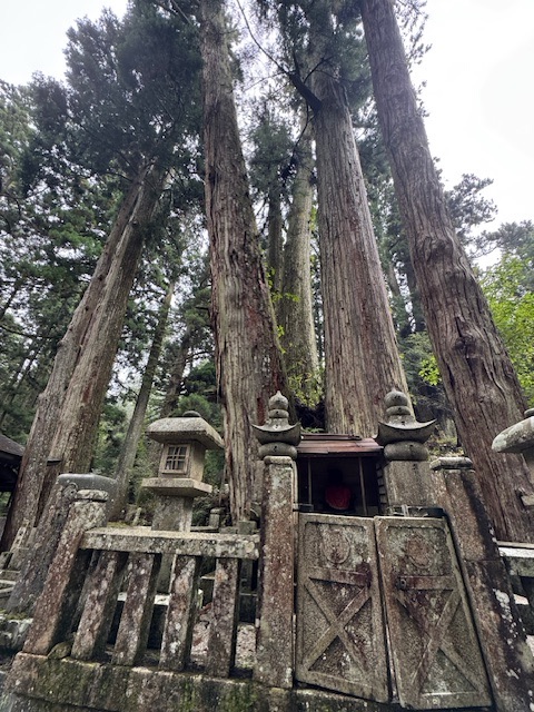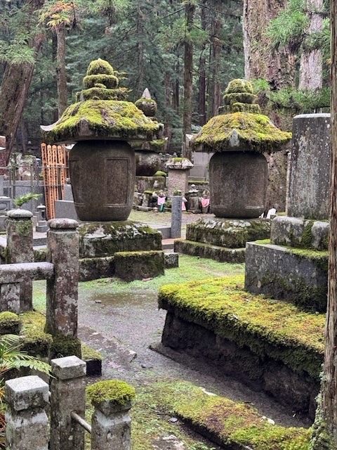 Beyond a handwashing stall lies Okuno-in, Japan’s largest cemetery and the most sacred site in Kōyasan. Centuries of history are preserved among towering cedar trees and moss-covered gravestones. As a genealogist, and lover of history, I enjoy exploring. I can’t read any engravings, but I admire the carvings and craftsmanship. But the star of the cemetery is the grave of Kōbō Daishi himself.