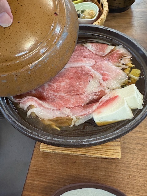 Lunch is Kaiseki-style: an elaborate meal with multiple courses. Having so many courses allows for the picking and choosing of what my chopsticks touches. The gelatinous goop, white tofu, and seaweed, no matter how cutely prepared, is left untouched. In fact, the biggest complaint is the amount of food waste occurring. The meat and mushroom pot is delicious.