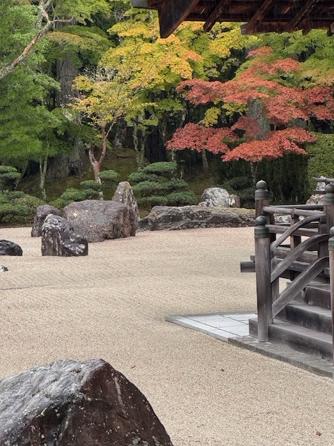 Banryutei Rock Garden is the largest rock garden in Japan (over 25,000 square feet). The design is of a pair of dragons emerging from a sea of clouds to protect the inner teachings. The dragons are made of 140 pieces of granite brought from Shikoku and the white sand is from Kyoto.