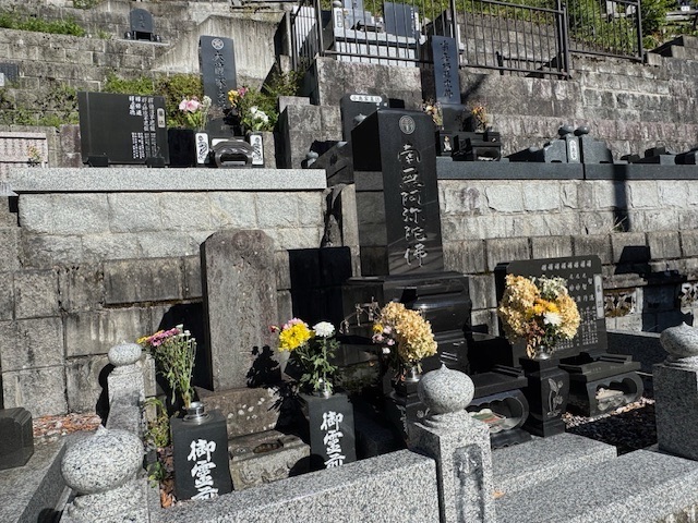 The temple grounds hold the graves of notable individuals. There are also several stone carvings and an excellent Jizō statue. To the right of the entrance is a small Buddhist cemetery.