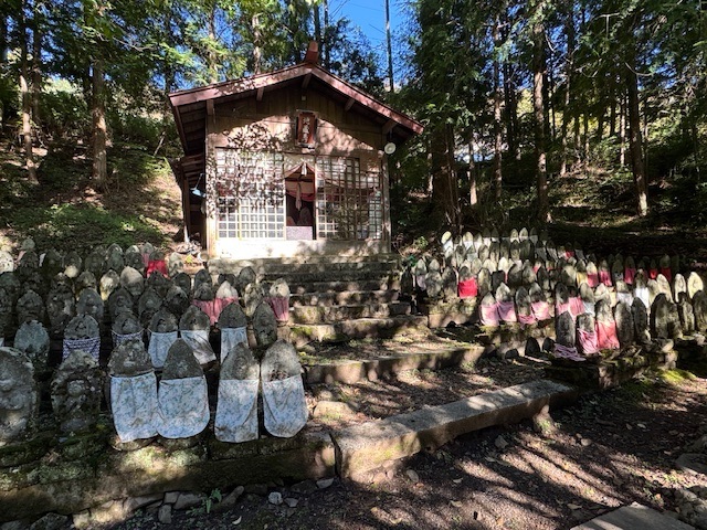 In front of a small shrine, under tall cedar trees, you find around 200 small, stone Jizō statues shaped like children or depictions of Buddha. Collected during the Meiji era when modern infrastructure threatened their original locations, these figures were positioned here as a cluster of quiet guardians.