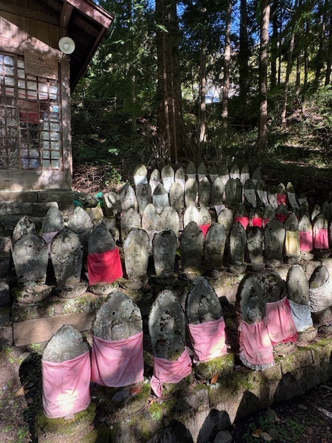 At one end of Nakasendō, across from the train staton, there exists a small side road to the left. Up that lane, about a block, on the left, are some wide stone stairs. A quiet shaded pathway leads to Nihyaku Jizoson.