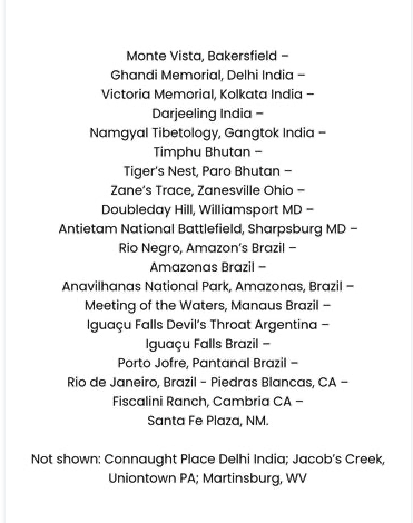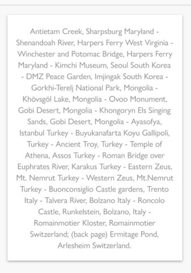 Jim rests at Antietam Creek, Harpers Ferry, the DMZ in Seoul South Korea, and among the monuments and Singing Sands of the Gobi Desert in Mongolia. We enjoyed hiking around the Khövsgöc Lake of Mongolia; the Ermitage Pond in Switzerland; to Roncolo Castle in Bolzano, Italy; and around the ruins of Turkey’s Ancient Troy and Gallipoli.