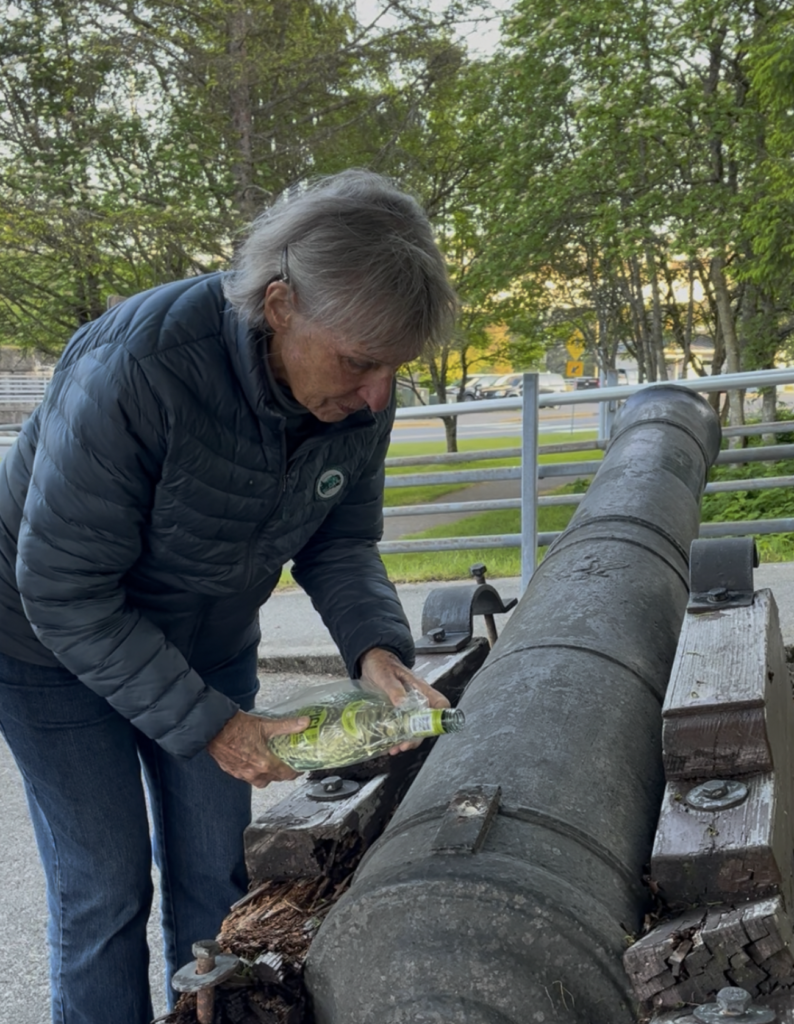 His daughter, Terri, and Phoebe graced a cannon with Jim’s spirit at Baranof Fortress in Sitka, Alaska.