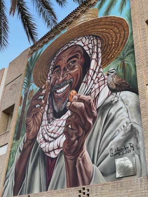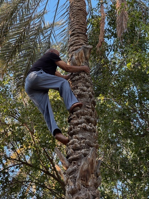 We walked around a date tree orchard and learned all about harvesting them. The farmer works the tree estate for the owner for a percentage of profits. He showed us how he climbs the tree for trimming, fertilizing and harvesting. Tough work and done barefooted! Dates are served at every meal and they are delicious.