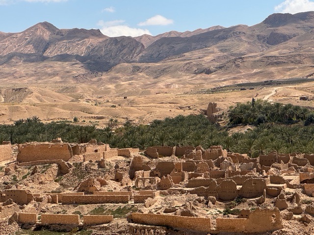 Midès Oasis represents the third of the three famous mountain oases in southwestern Tunisia, (alongside Chebika and Tamerza). The Oasis sets among towering, geologically dramatic canyons carved by water over millennia. Theoasis is nestled at the edge of steep cliffs. Its springs and seasonal riverbed (wadi) known as Oued Oudeï provide life to date palms, fruit trees, vegetables, and lush vegetation amid an otherwise dry, rugged landscape (and probably waters that soccer stadum).
