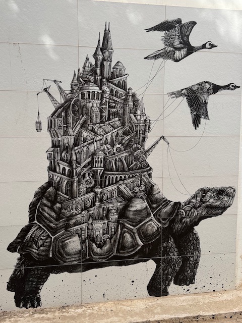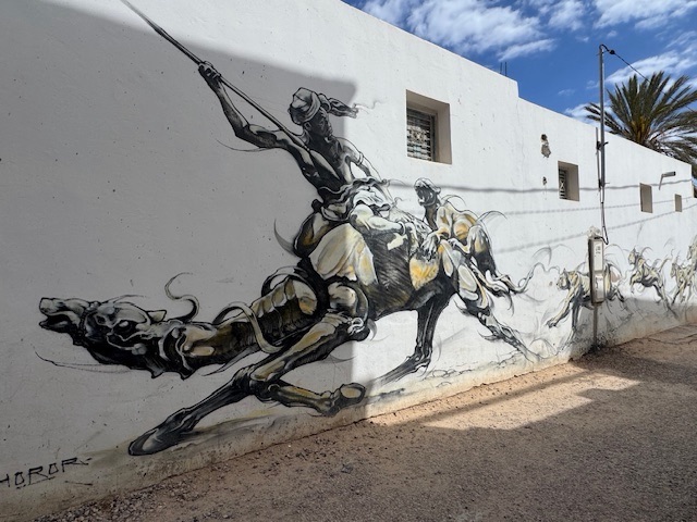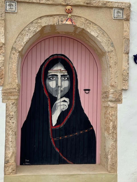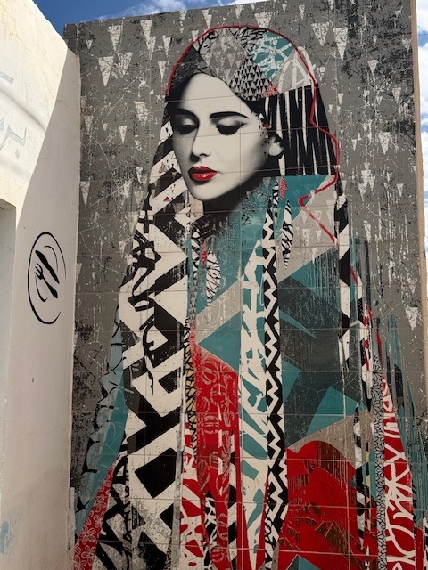 Walking the streets of The Hood feels like wandering through a living gallery. You’ll see bold murals mixed with subtle calligraphy and geometric patterns inspired by Amazigh (the indigenous Berbers). Islamic art, portraits, abstract pieces, and playful visual jokes tuck into corners and doorways. The art is beautiful with a little something for everyone. What makes it special is the contrast: contemporary global street art set against centuries-old homes, white-washed walls, quiet lanes, and among everyday village life, where laundry flaps above a mural and a painted doorway still leads to someone’s kitchen.