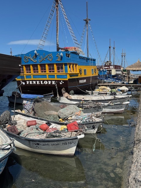 We enjoy a short walk around the marina. Boats from derelict pirate ships and masted schooners to small fishing boats crowd the ports. Fish, crab, and octopus represent much of the local catch. Andò. The port, we drive up to the ferry on which we plan to leave the island of Djerba.
