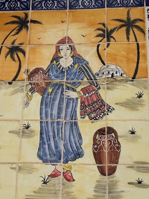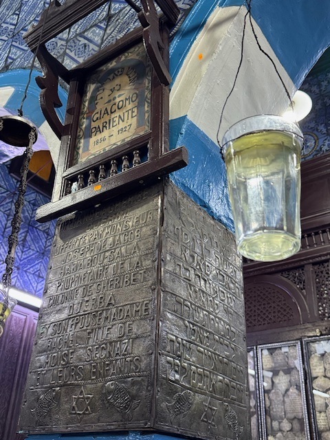 These mosaics demonstrate richly patterned with geometric and floral designs typical of Tunisian craftsmanship. However, what makes them special is how they blend Jewish symbolism with local North African decorative tradition. I see repeating stars, stylized vines, and symmetrical motifs that create a calm, almost meditative rhythm across the walls. The reflecting light off the tiles gives the interior a calm, luminous glow.