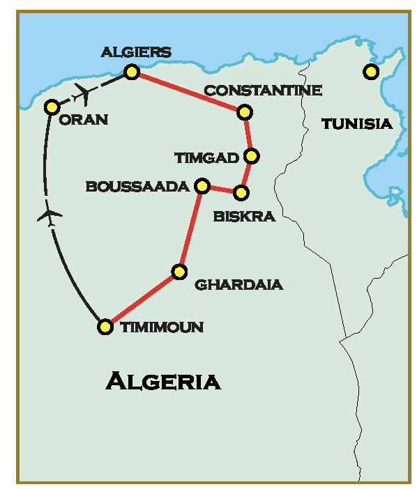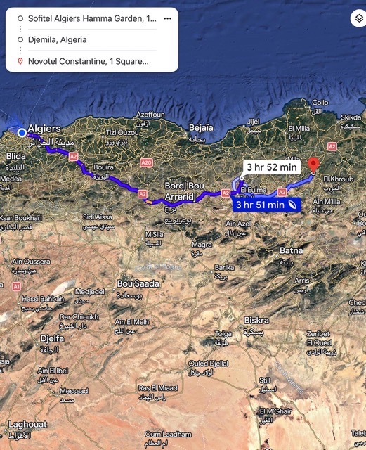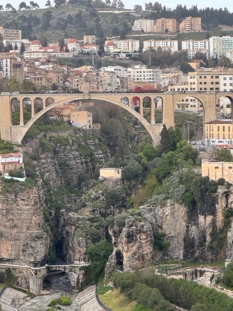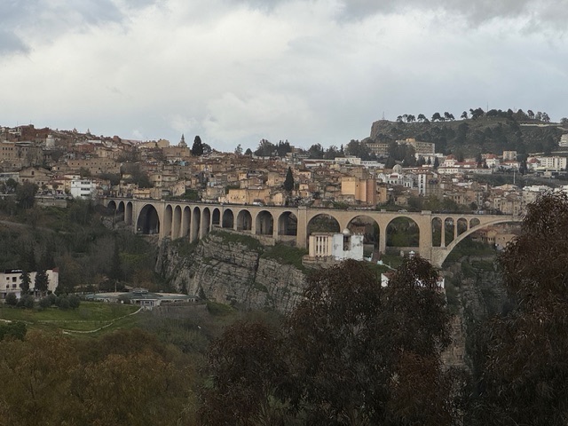 We depart Algeria and travel to Constantine – a long, long 275-mile drive. The guide describes it as embarking on “a captivating journey.” Skies loom gray, rain falls and wind gusts.