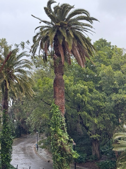 Flags flap perpendicular. The gardens and trees take the wind in stride. For me, a good day sitting in a bus.