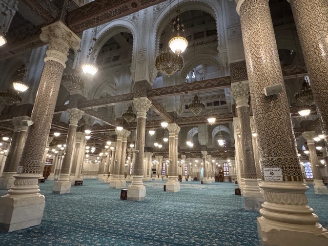 Inside, the prayer hall is spacious, designed to accommodate 15,000 worshippers. Rows of elegant, slender marble pillars support the space and create a sense of order, drawing the eye toward the mihrab at the front. These pillars are spaced to balance structural support with an open, uncluttered feeling, giving the hall a sense of expansiveness.