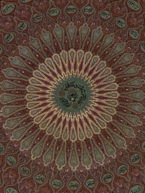 The central dome soars approximately 130’ above the prayer hall. Its height creates a feeling of vertical grandeur, emphasizing both the spiritual and architectural scale of the mosque. Smaller surrounding domes and arches complement the central dome, enhancing acoustics and light distribution. Geometric patterns, arabesques, and subtle ornamentation decorate the ceiling.