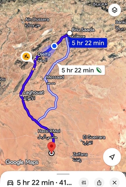 As we approached Djelfa, the desert intensifies. Palm groves disappear, the soil lightens in color, and agriculture becomes less visible, signaling the absence of water and oasis life. It is time for some historical distraction about what lies ahead in Ghardaïa.