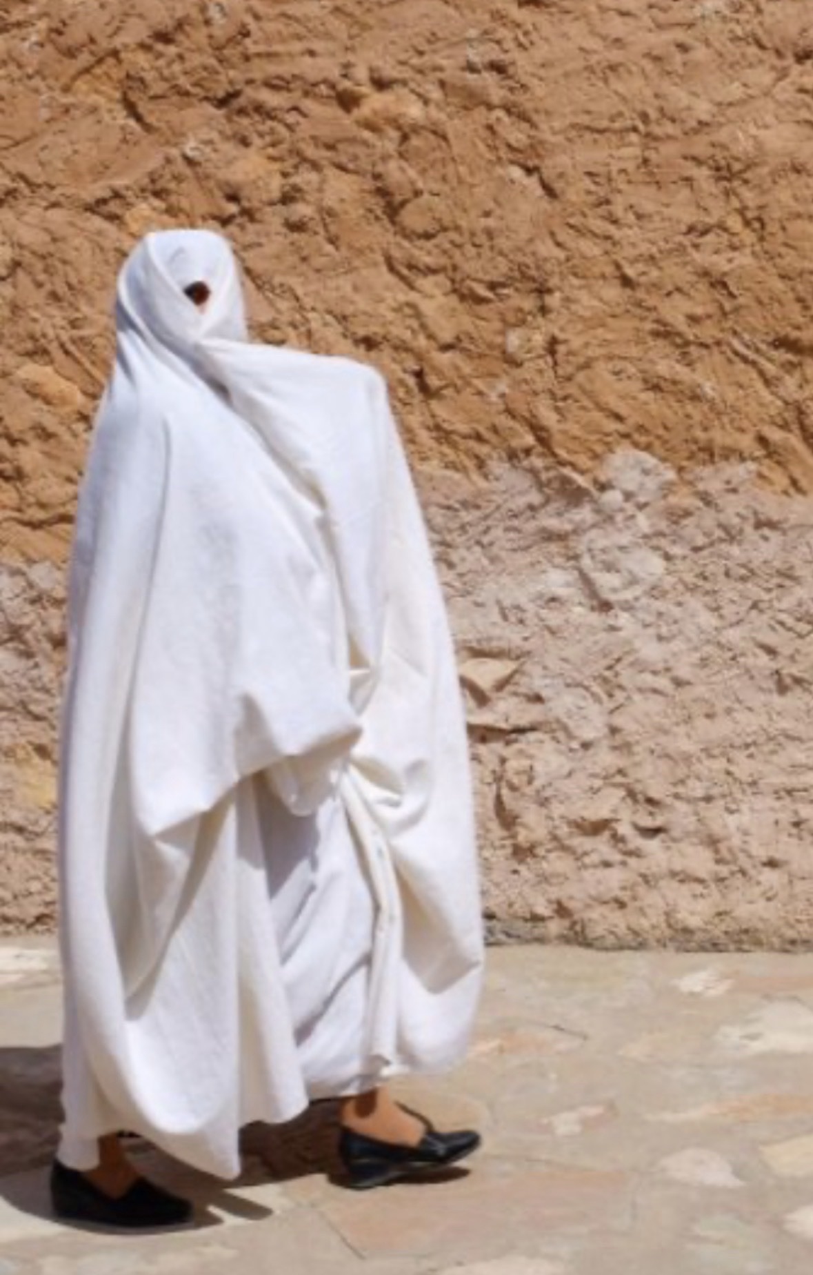 Amazigh wear distinctive jewelry and often braided hairstyles. Men often wearing simple white robes and skullcaps. The people adapt their clothing to this Sahara environment. Women traditionally wearing a white haïk veil, sometimes covering most of the face except one eye.