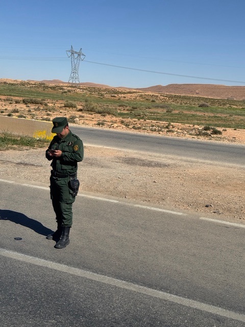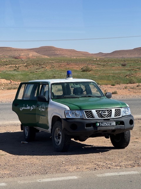 Then comes the standoff near Laghouat. We are directed into the town of Bellil, allegedly to meet our next escort. Instead, we meet a police station, some chairs, and time itself slowing to a crawl. Our escort, we learn, is coming from Ghardaïa, located at least an hour away and apparently in no particular hurry. This, we assume, is a character-building exercise.