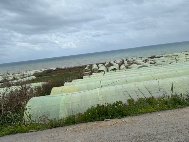 Multitudes of hot houses and vast vegetable fields and orchards cover the land all the way to the sea. Garlic, tomatoes, strawberries, lemons, potatoes, olives, almonds, grapes, even Algerian bananas (more like plantain).